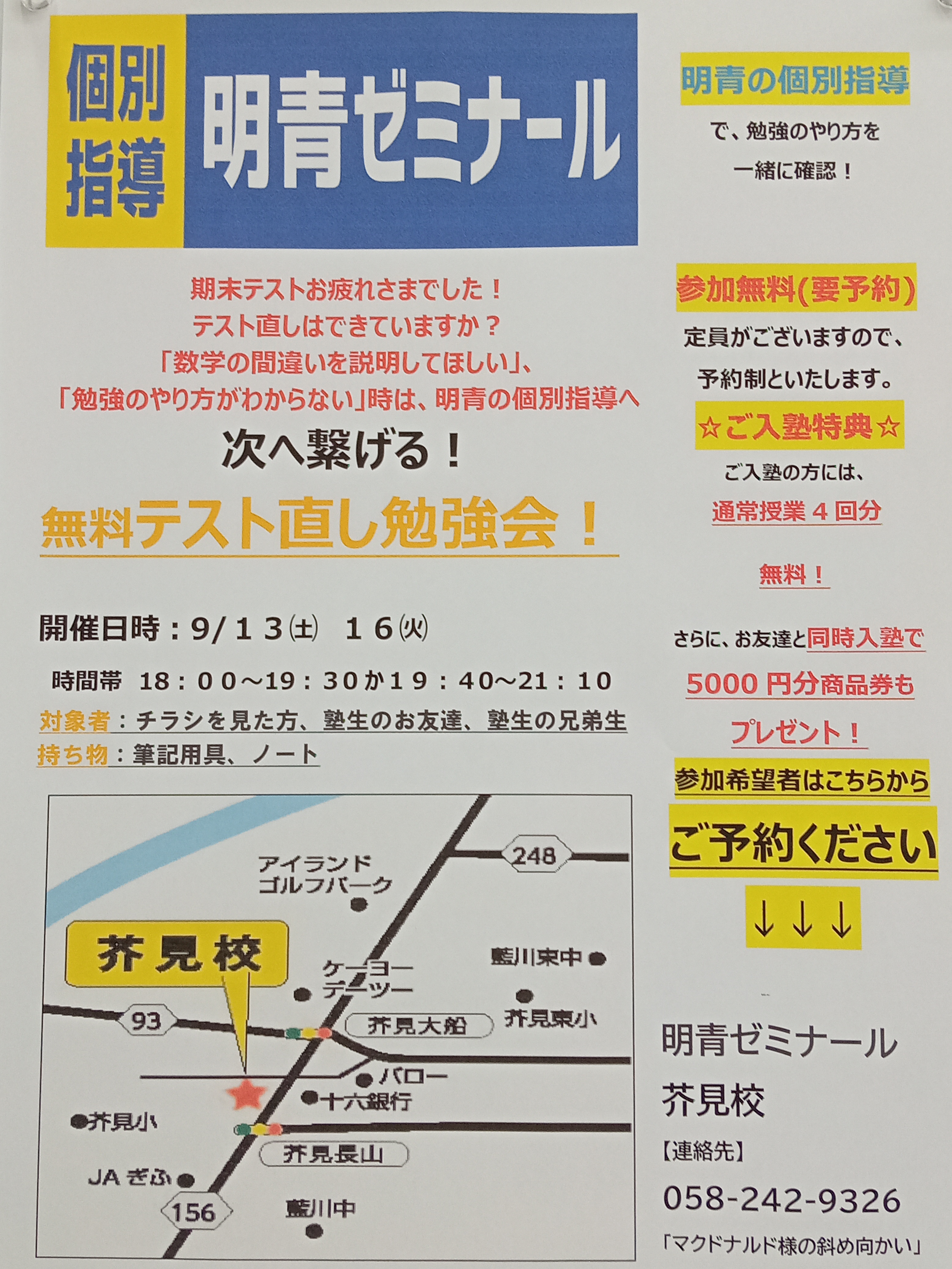 明青ゼミナール芥見校では下記のスケジュールで「テスト直し勉強会」を