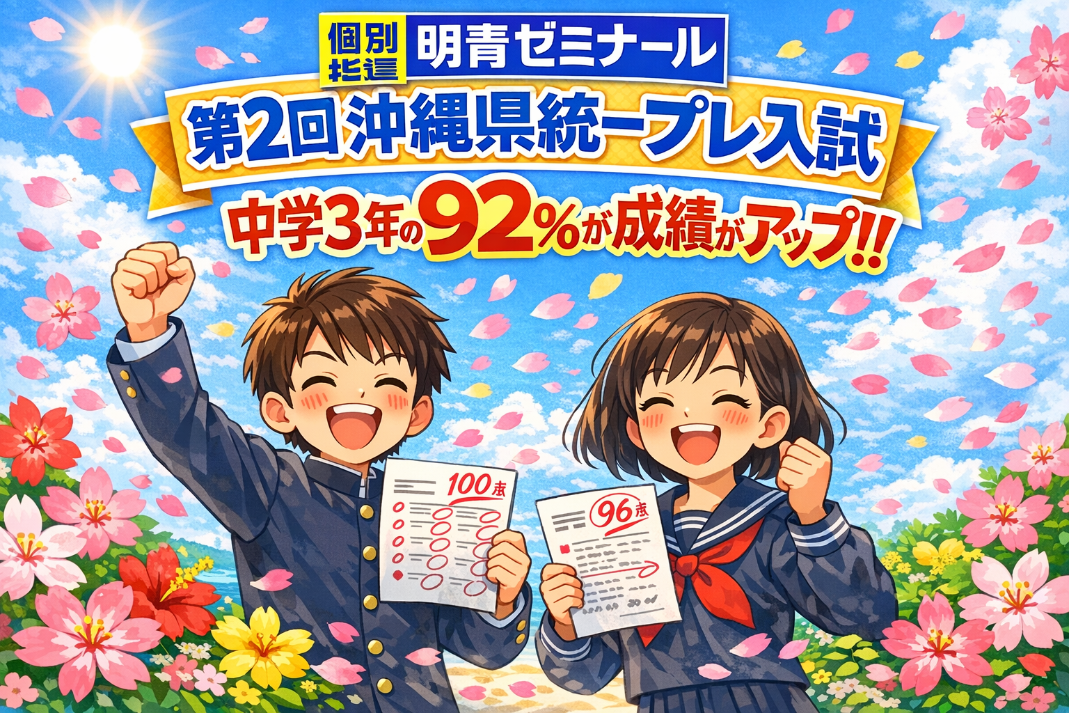 ■ 中3模試結果速報!92%が成績・偏差値アップ! 第2回沖縄県統一プレ入試の結果が返ってきました。 今回の模試では、明青ゼミナールの中学3年生の92%が成績・偏差値アップ! 努力の成果が、数字としてしっかり表れています・・・