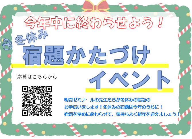 明青ゼミナール木曽川校で「冬休み⛄宿題おかたづけイベント🌟」を開催!冬休みの宿題をサクッと終わらせて、年末年始を思いっきり楽しもう📯 小4〜中学生なら誰でも参加OK。申込は12/22(月)まで!