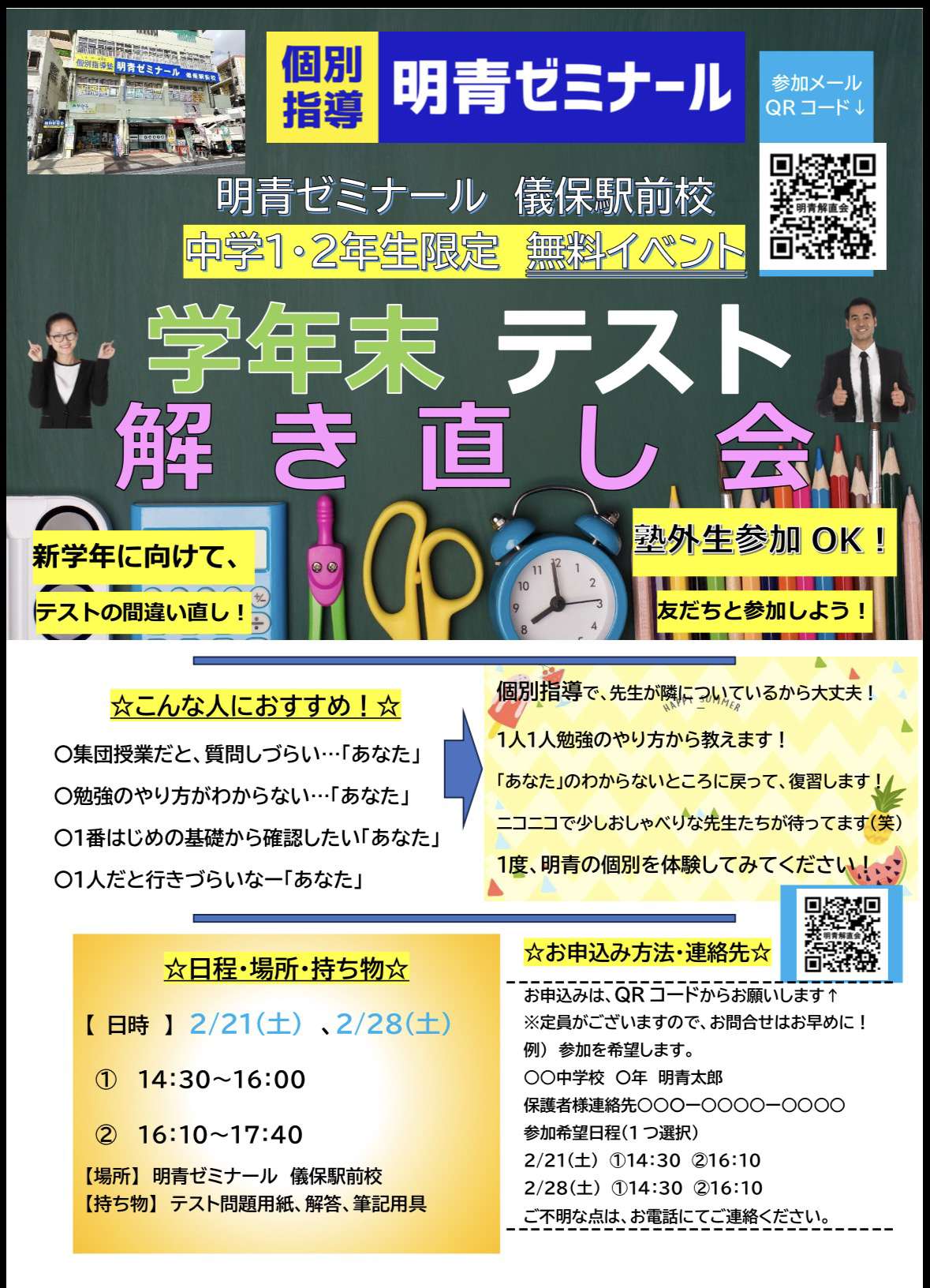 ※持ち物:定期テストの問題・解答用紙、筆記用具