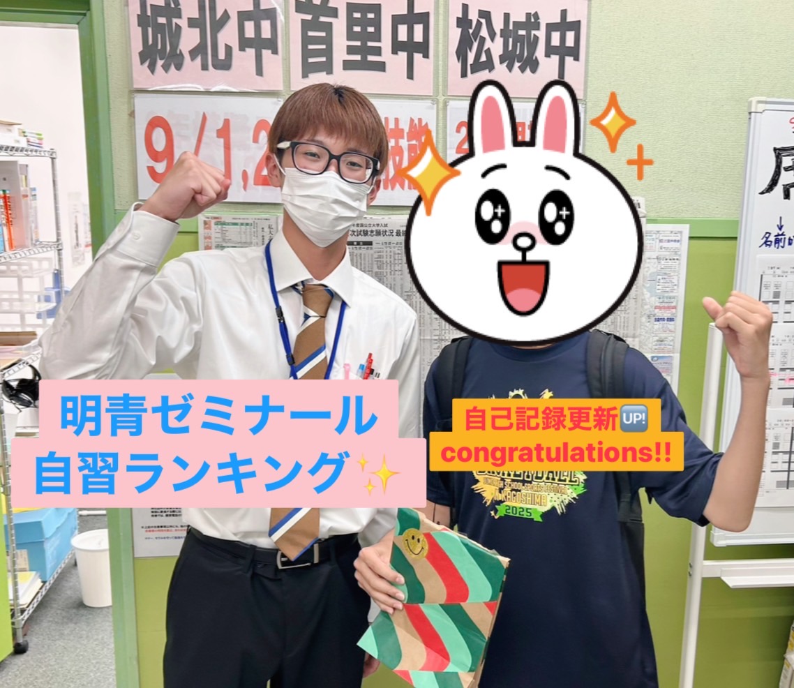 城北中、首里中、松城中のみなさん。定期テストお疲れさまでした。 今回のテストでも、「過去最高得点↑」「席次59番アップ↑」など嬉しい報告がありました! 自習ランキングを実施して、塾の自習時間を集計して、ランキングを出しています! ランクインする生徒たちは、やはり席次が上がっています✨