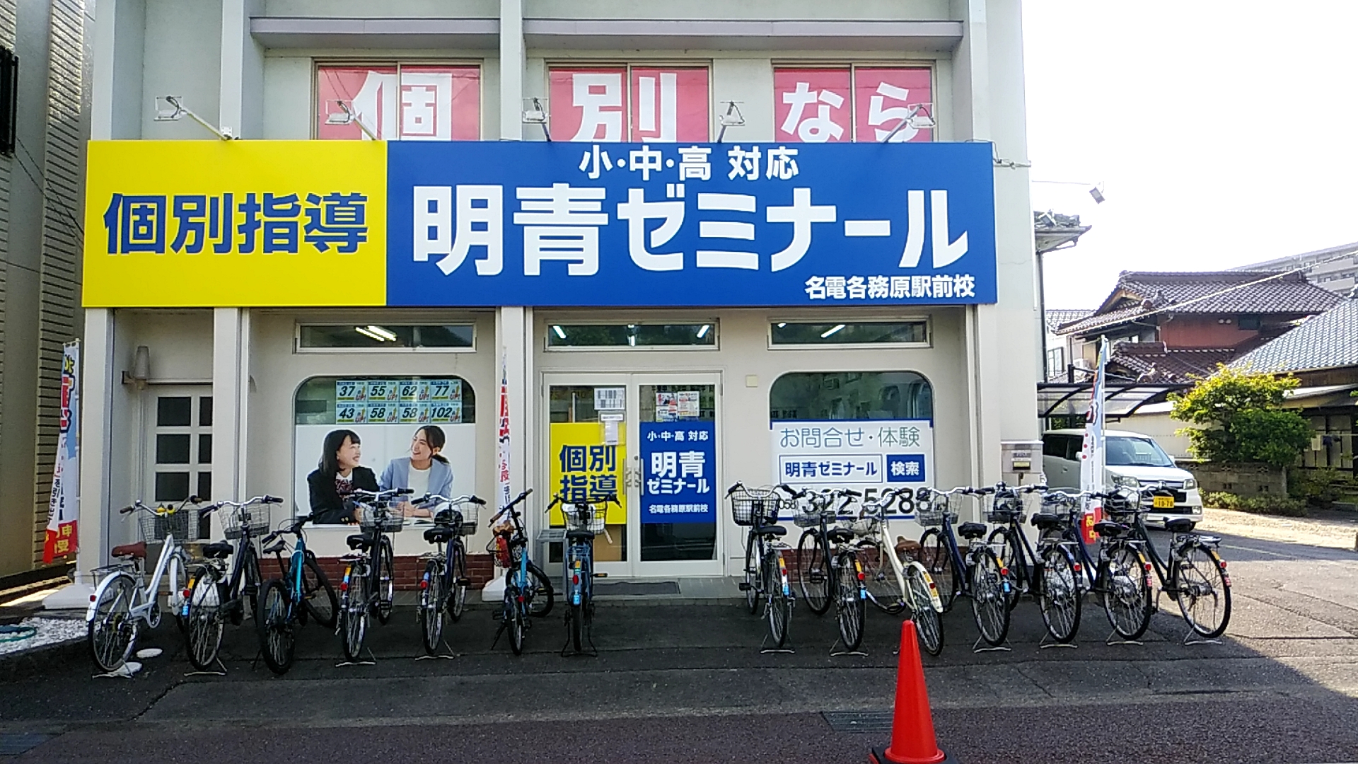 『明青ゼミナール』は、青色と黄色の看板 が目印です!