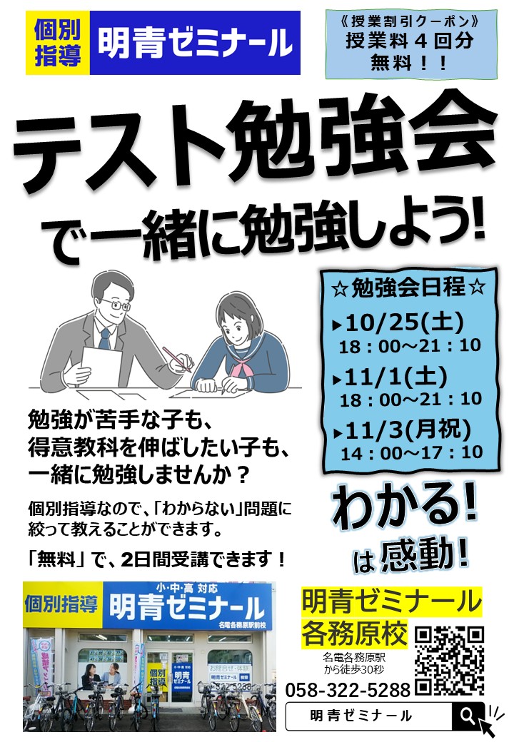 明青ゼミナール各務原校では毎回、中央中学校・鵜沼中学校・稲羽中学校・緑陽中学校向けにテスト対策を行ってます。