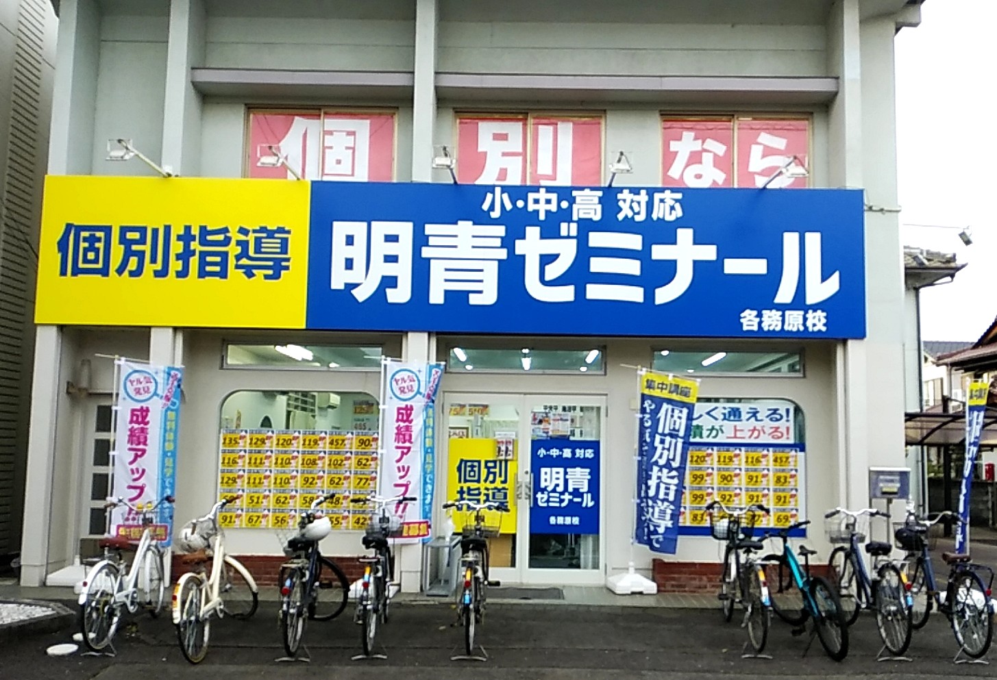 『明青ゼミナール』は、黄色と青色の看板 が目印です!