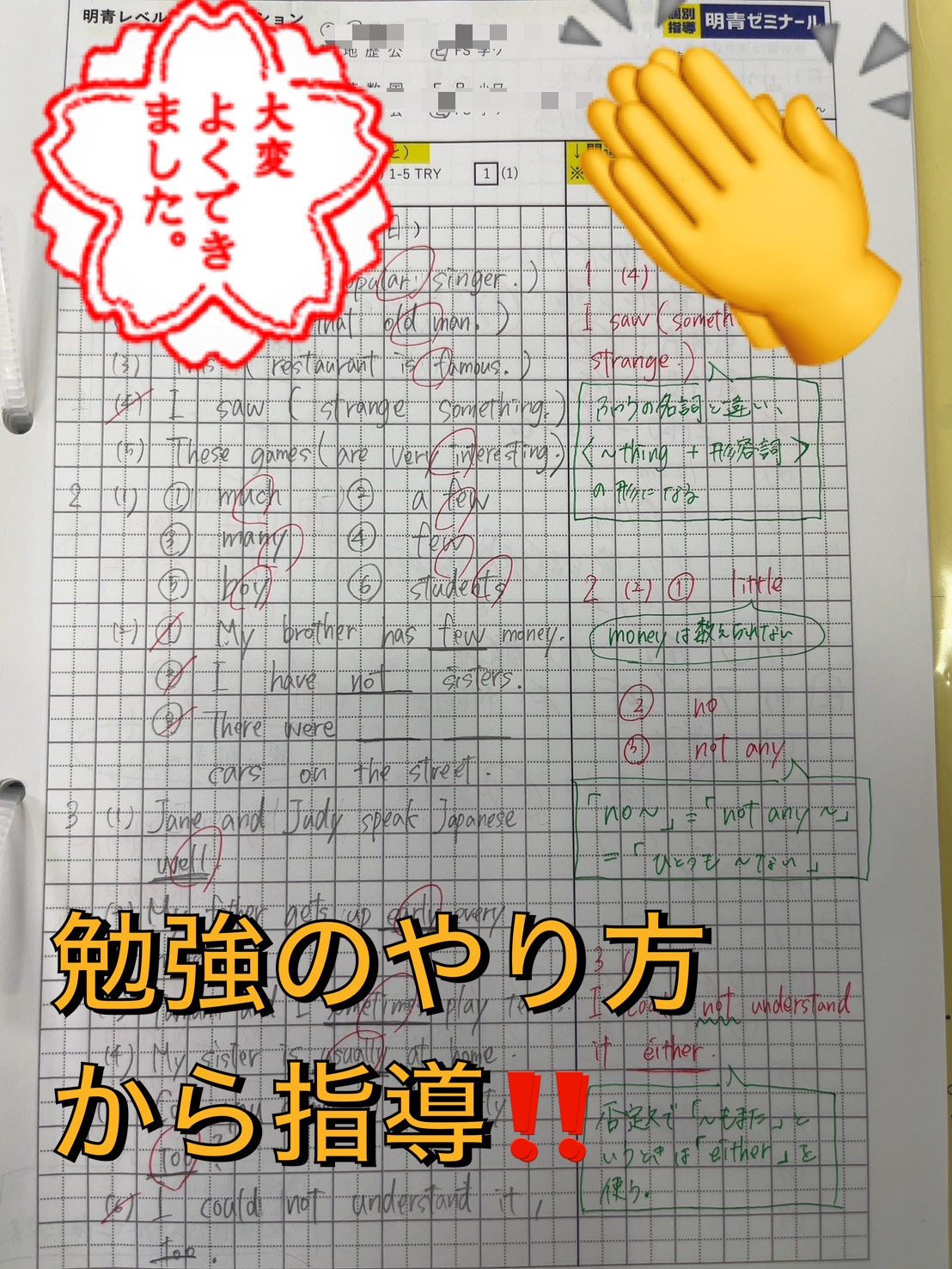 明青ゼミナールでは、宿題【レベルアップ・ミッション】の独自の用紙を活用して、自己のレベルアップを図るために学習のやり方から指導しています!