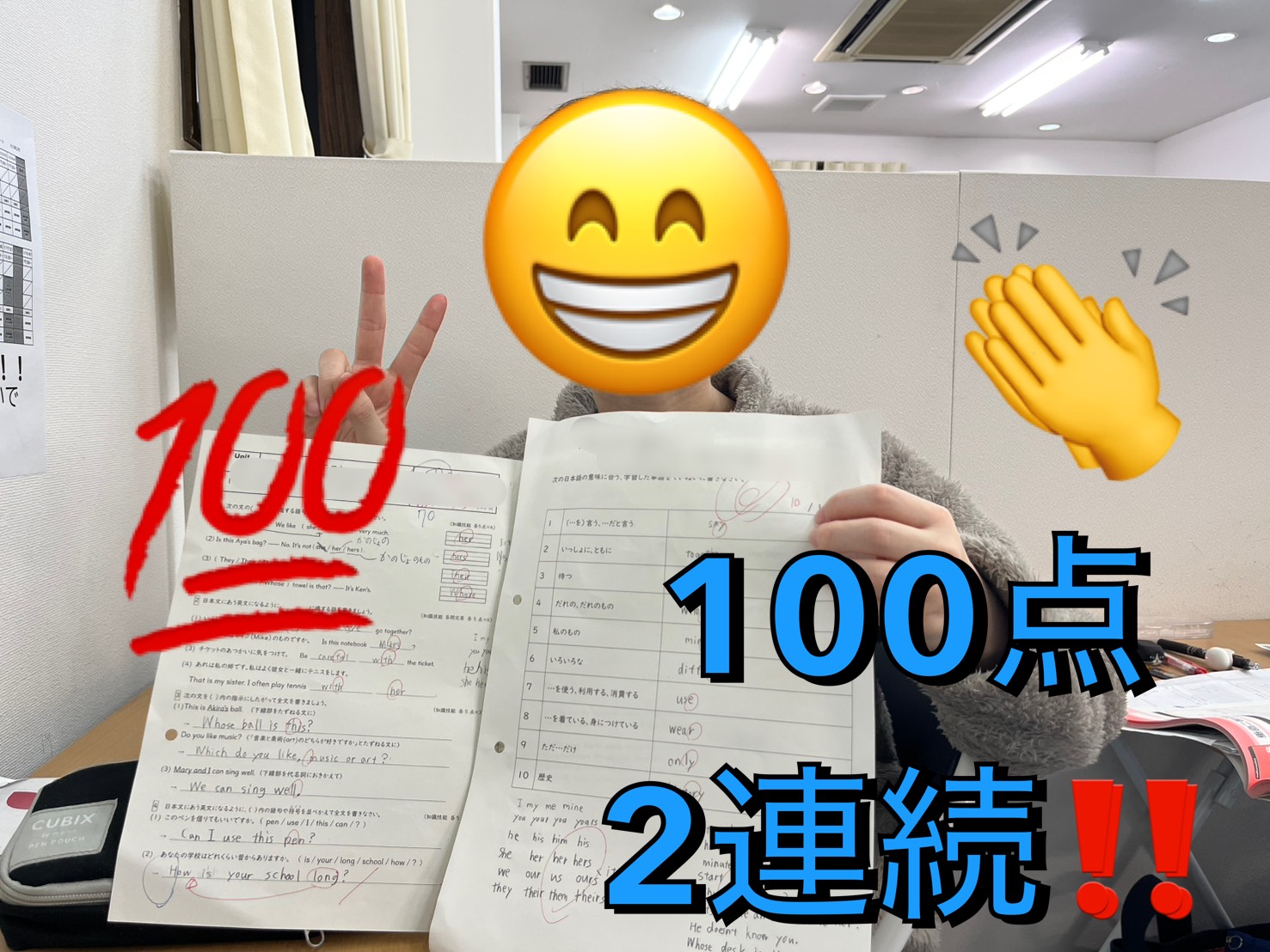 M君以外にも普段の小テストや単元テスト、漢字50問テストなど多くの生徒さんたちが一生懸命に学習に取り組んでいます✨